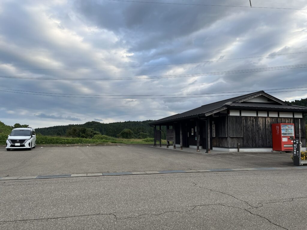 増山城の駐車場と増山陣屋。陣屋はトイレ完備の資料室兼休憩所だが、営業時間は8時半から17時で、時間外は施錠されている。駐車場はいつでも停められるもののこの周辺に街灯はないため、夜間早朝の運転には注意が必要だ。