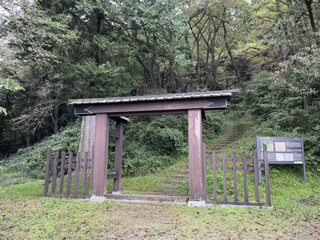 冠木門のある北西側登山口。増山城は平山城ではなく山城だということだが、このすぐ上に番所のような曲輪があるので、当時もここに門があった(=平山城)のではないかと個人的には思う。それと、冠木門といいながら見た目は高麗門風なのも気になる。