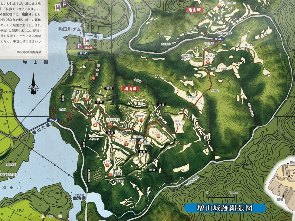 増山城の縄張図。登山口は西側、北西側、北東側の3ヶ所ある。そのうち増山大橋付近から登る西側登山口・通称「七曲がり」と、駐車場から近く冠木門のある北西側登山口「ウラナギ口」と呼ばれる遊歩道のどちらかが大手道だったと言われている。どちらも十分な防御態勢を敷いていることから日常的に使用されていた動線だと考えられるので、2本とも大手道だったのかも知れない。