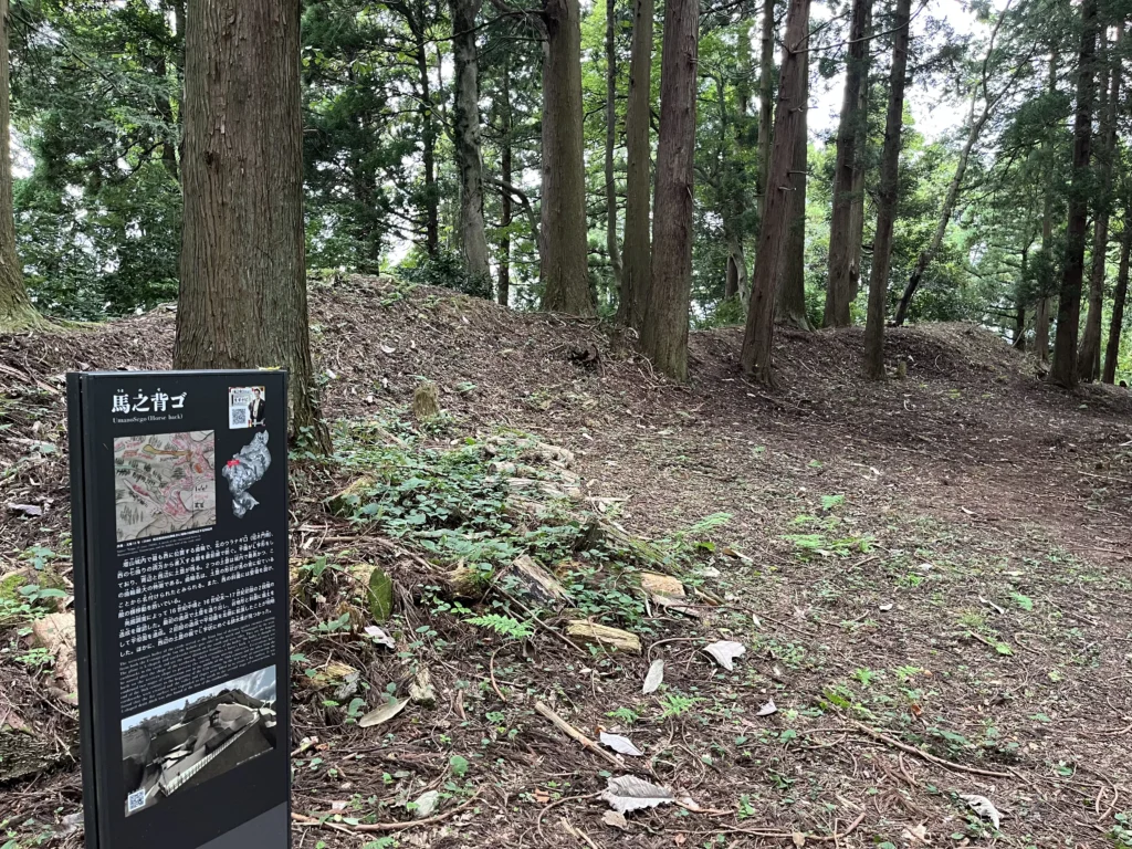 F郭の西側上部にある「馬之背ゴ」という名のL字型の曲輪。土塁を馬の背中に見立てている。西側大手道に面しているのとF郭を見下ろす立地なのとで、双方の防御の拠点となっている。