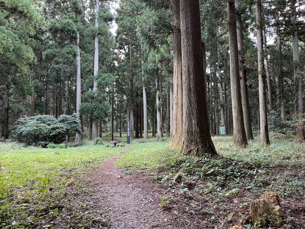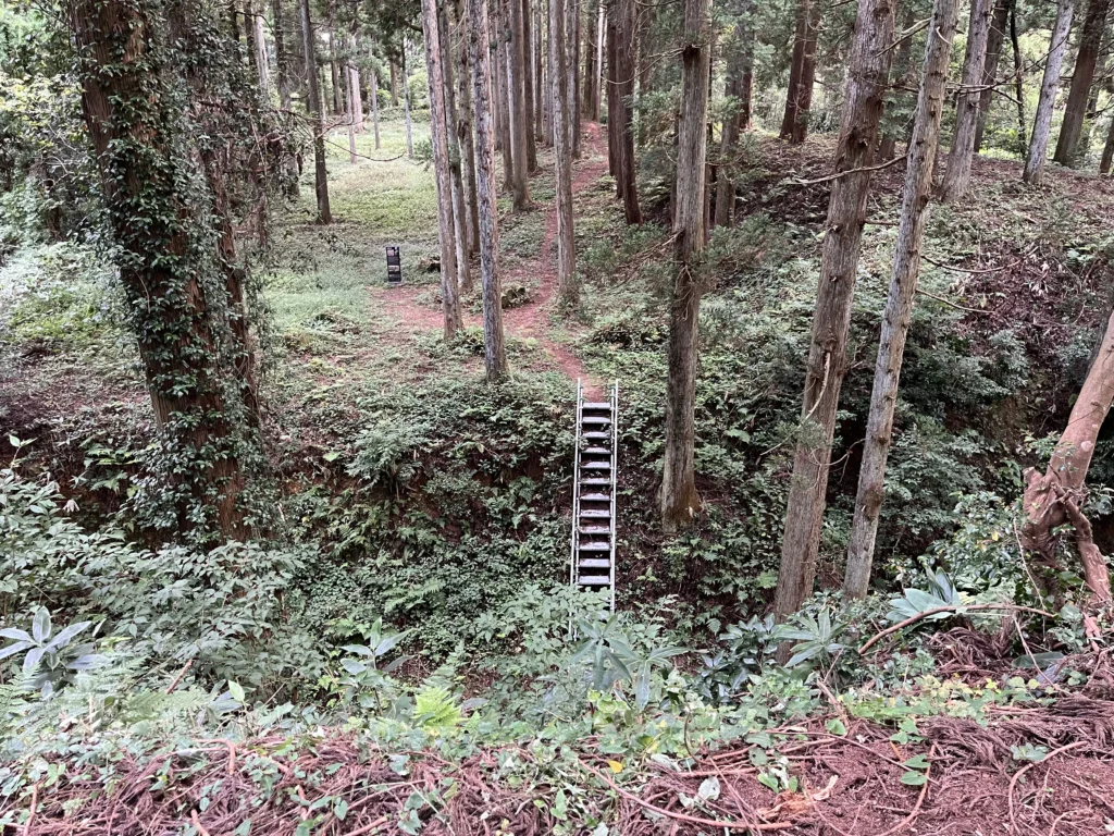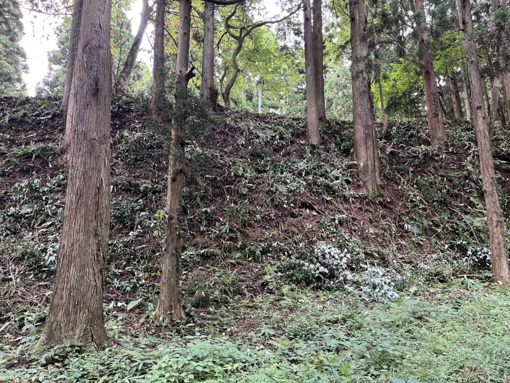 鐘楼堂跡の東側。こちらも堀切を介した先に三ノ丸がある。木が深いため写真ではほとんど分からないのは残念だが、木を切りすぎると地面が灌木で覆われて曲輪の形すら分からなくなる懸念があるため仕方のないところだろう。