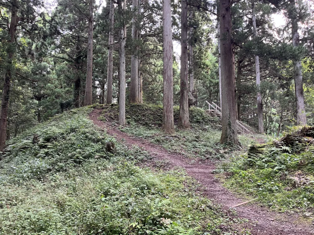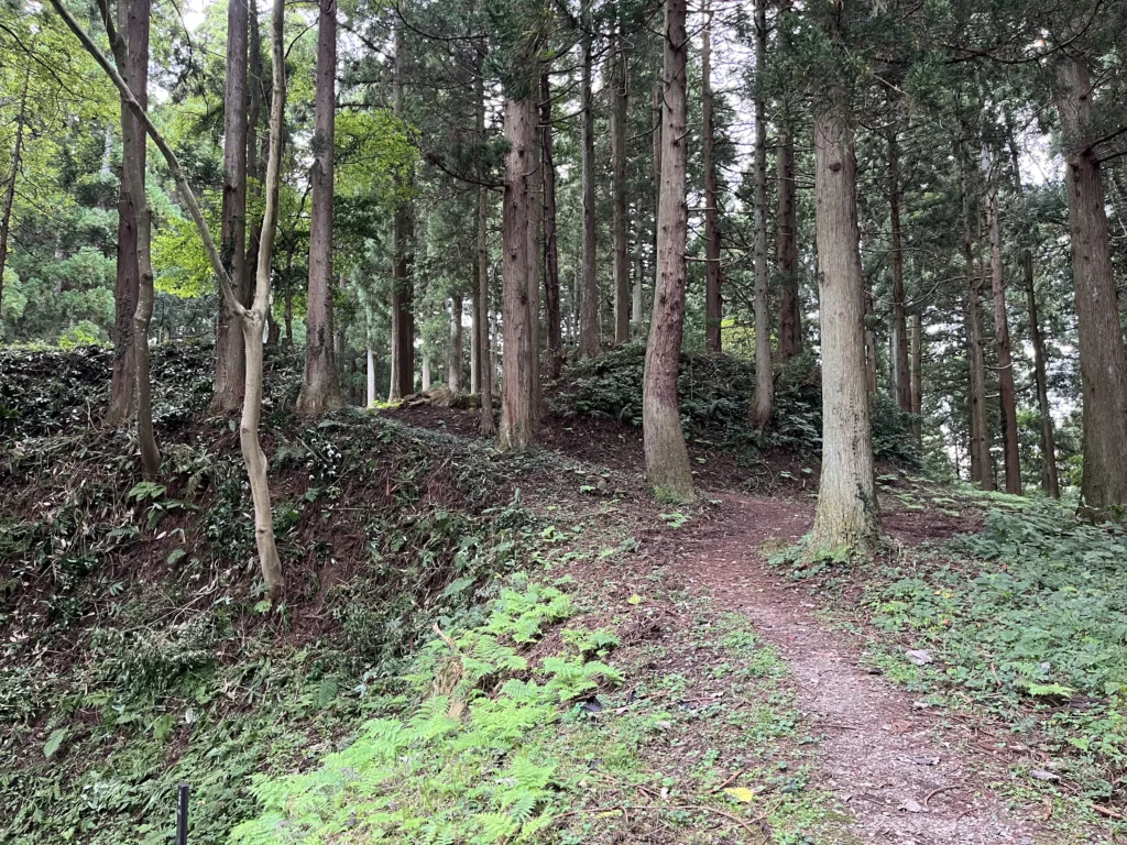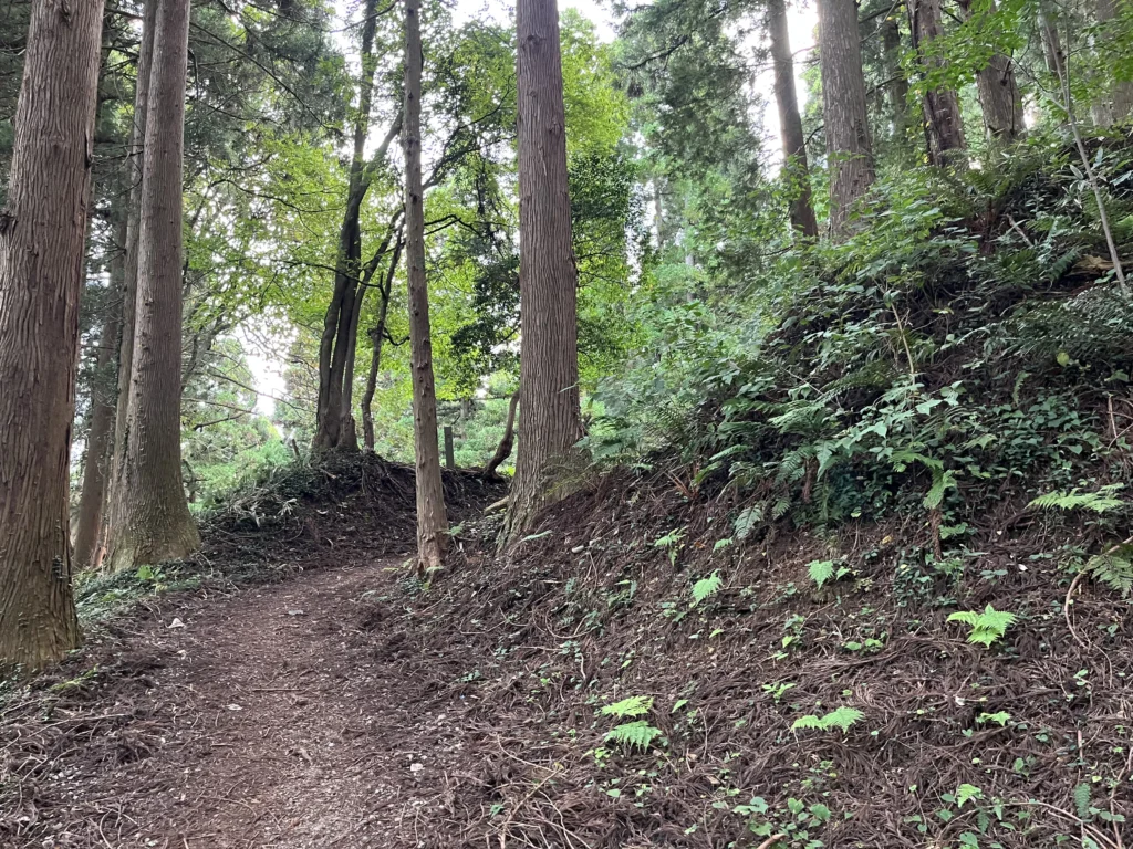 遊歩道は、当時はウラナギ口と呼ばれる登城道で、2つの尾根の谷間を真っ直ぐ延びている。2つの尾根は大堀切で遮断されているため、ここだけが通ることを許されている動線だ。