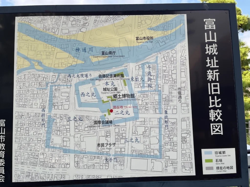 現在の地図に重ね合わせた富山城の縄張り図。これは江戸期の富山前田氏の頃のものだが、最初にこの地に城を築いたのは、越中の戦国大名・神保長職だ。