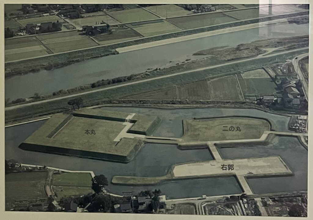 資料館にあった航空写真。本丸の左上角に櫓が建っていたと言われている。右郭の手前の土橋が城の唯一の入り口で、二の丸の右にある土橋は当時には無く、後世になって設けられた通路だ。