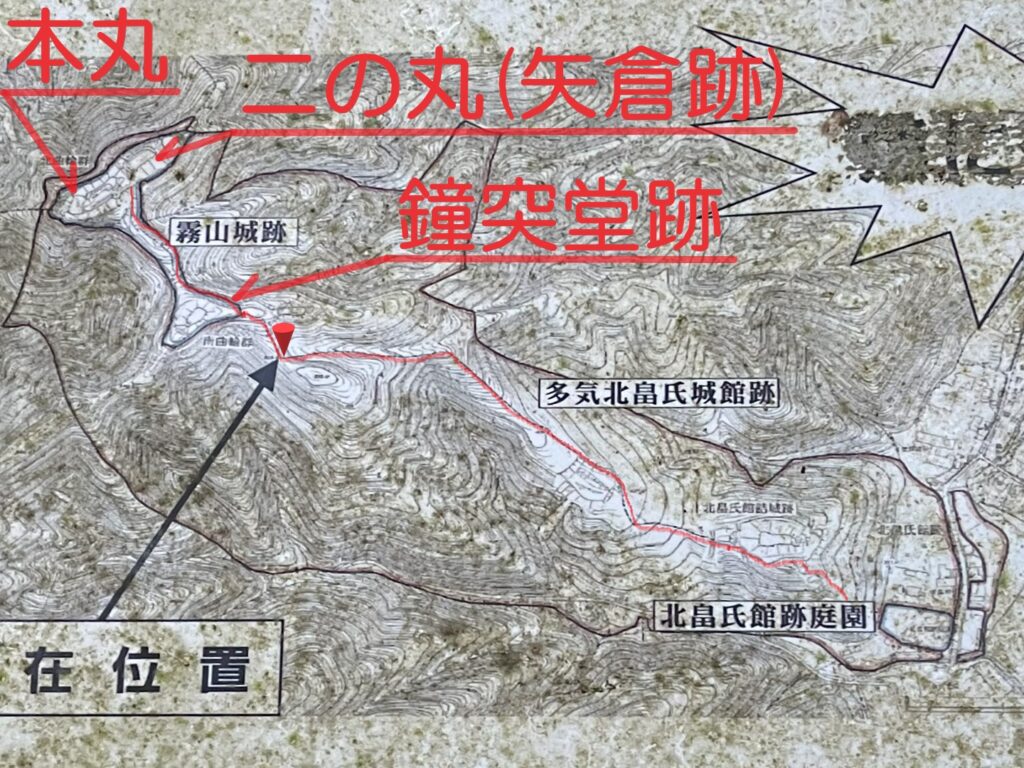 案内板の縄張り図。右手に行くと、主郭部(鐘突堂跡・矢倉跡・本丸)がある。
