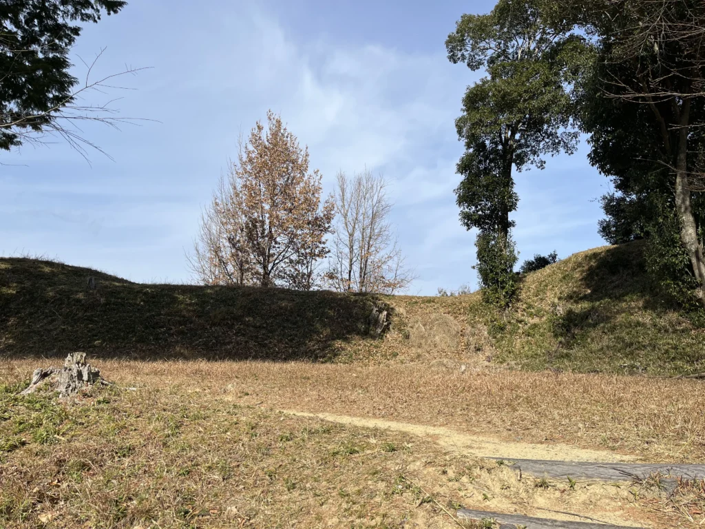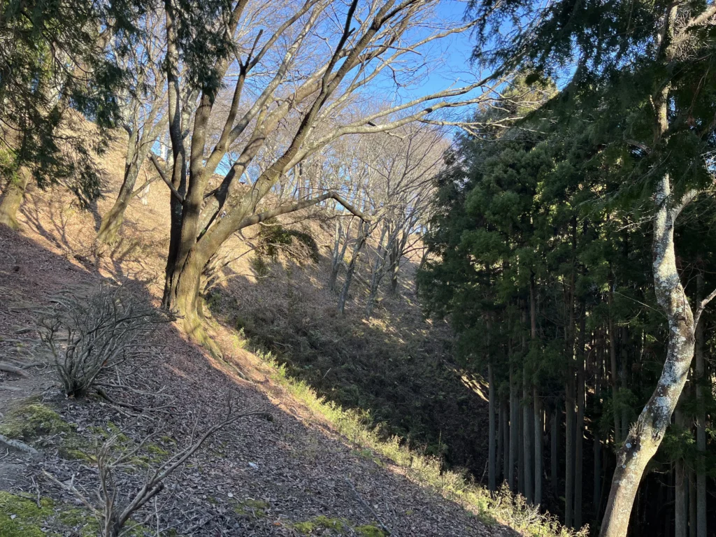 大手道の途中で、両側に切岸がそびえるVの字になった谷エリアがあった。敵兵が通るときは、左右から弓矢の一斉射撃を浴びることだろう。