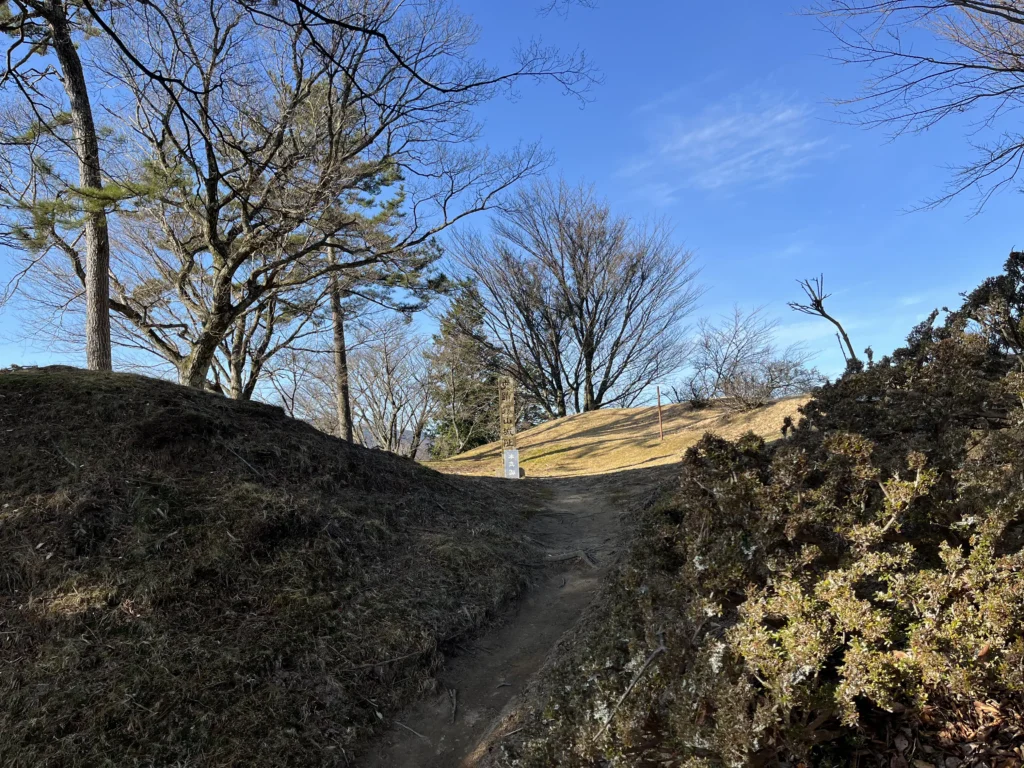 帯曲輪を歩いて本丸へ向かう。右手は深い切岸、左手は高い切岸で上に曲輪があると思われる。敵兵を狙い撃ちするための最後の防衛ラインだろう。