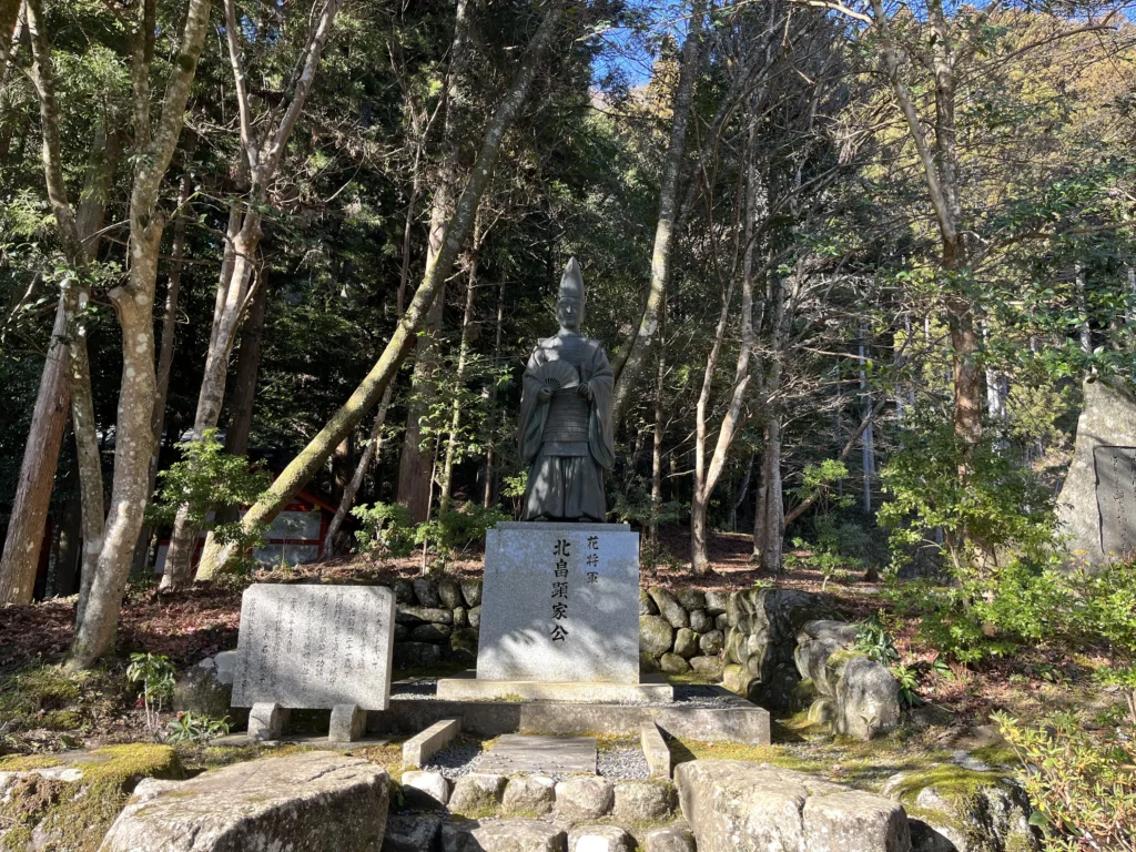 花将軍・北畠顕家公の像。伊勢北畠氏の祖・北畠顕能の兄であり、多気北畠氏城館跡とは何の関係もないのだが、南北朝時代を代表する人物ということでネームバリューで建てられたのだろう。