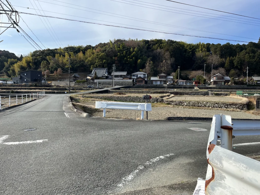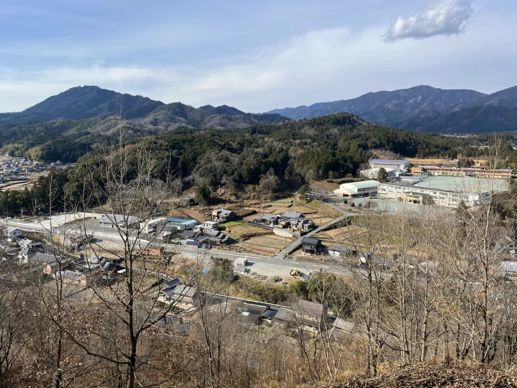 大河内城跡への道のり。あの山が大河内城になる。右へ向かえば大手口だが、搦手口のほうが近いので真っ直ぐ進む。