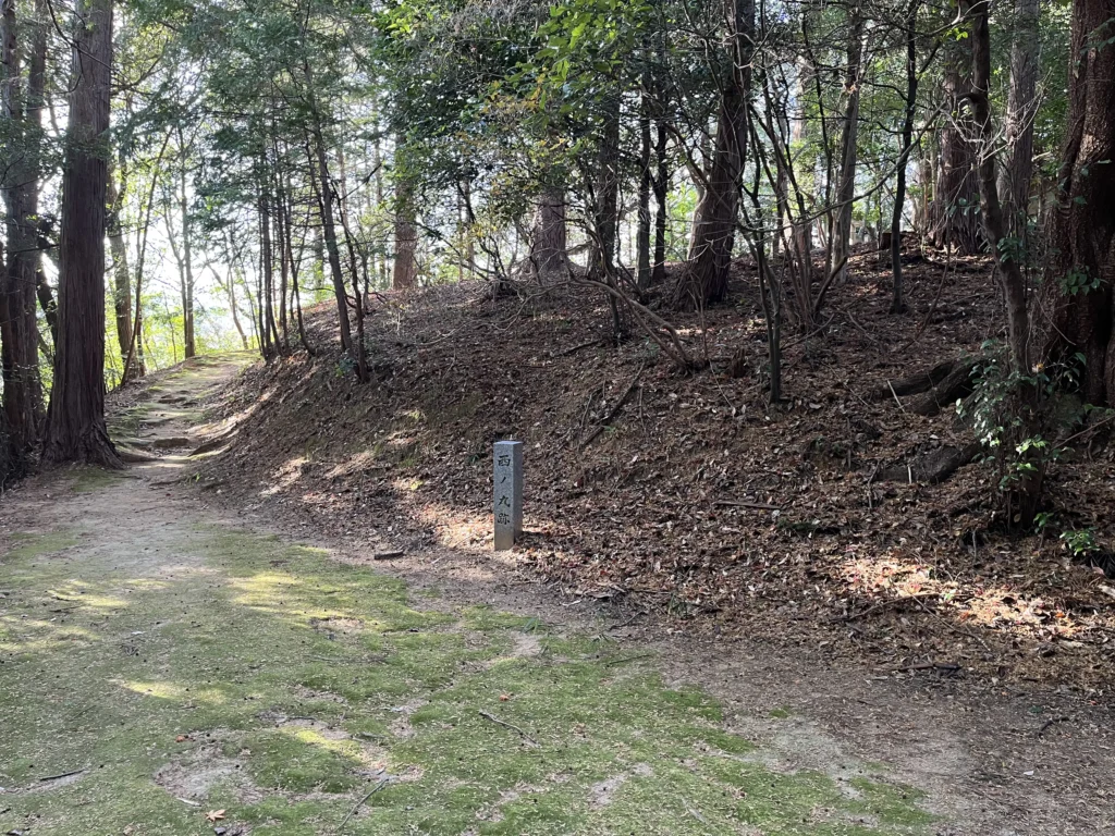 比高80mにある独立した曲輪・北畠氏館詰城を通り過ぎ(案内板に現在地付きの縄張図があったのによく見ておらず肝心な本郭の写真なし T_T)、大手道を進む。